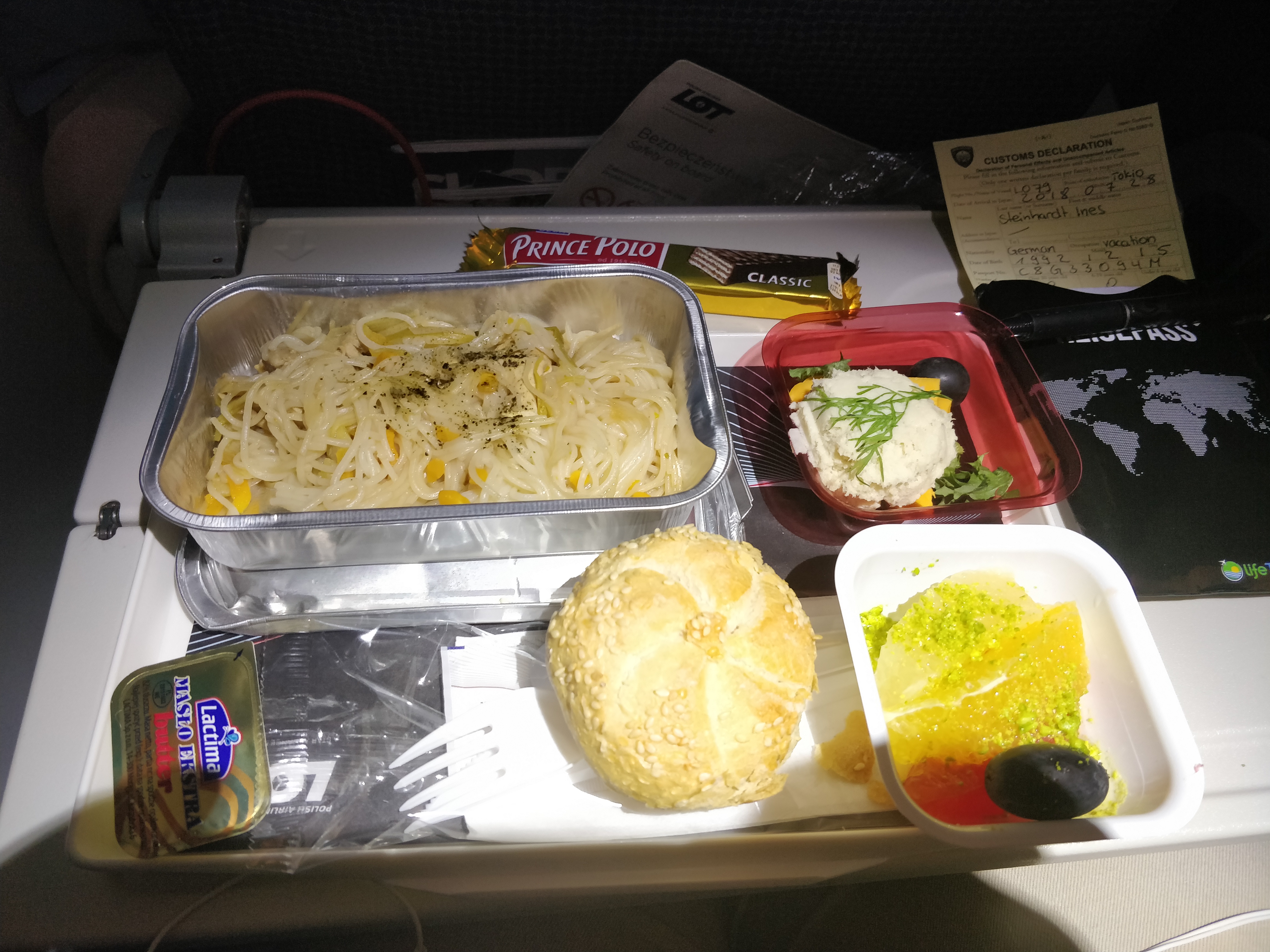 Die Verpflegung beim Langstreckenflug war natürlich um Weiten besser als die der Kurzstrecke. So gehörten neben zwei Hauptmahlzeiten auch diverse Durchgänge kostenloser Getränke sowie einmal eine Runde Erdnüsse mit zum Programm. Das Essen ist jetzt sicher keine fünf Sterne Kost, jedoch gibt es immerhin jeweils zwei Menüs zur Auswahl, die alle sehr umfangreich und durchaus genießbar waren.