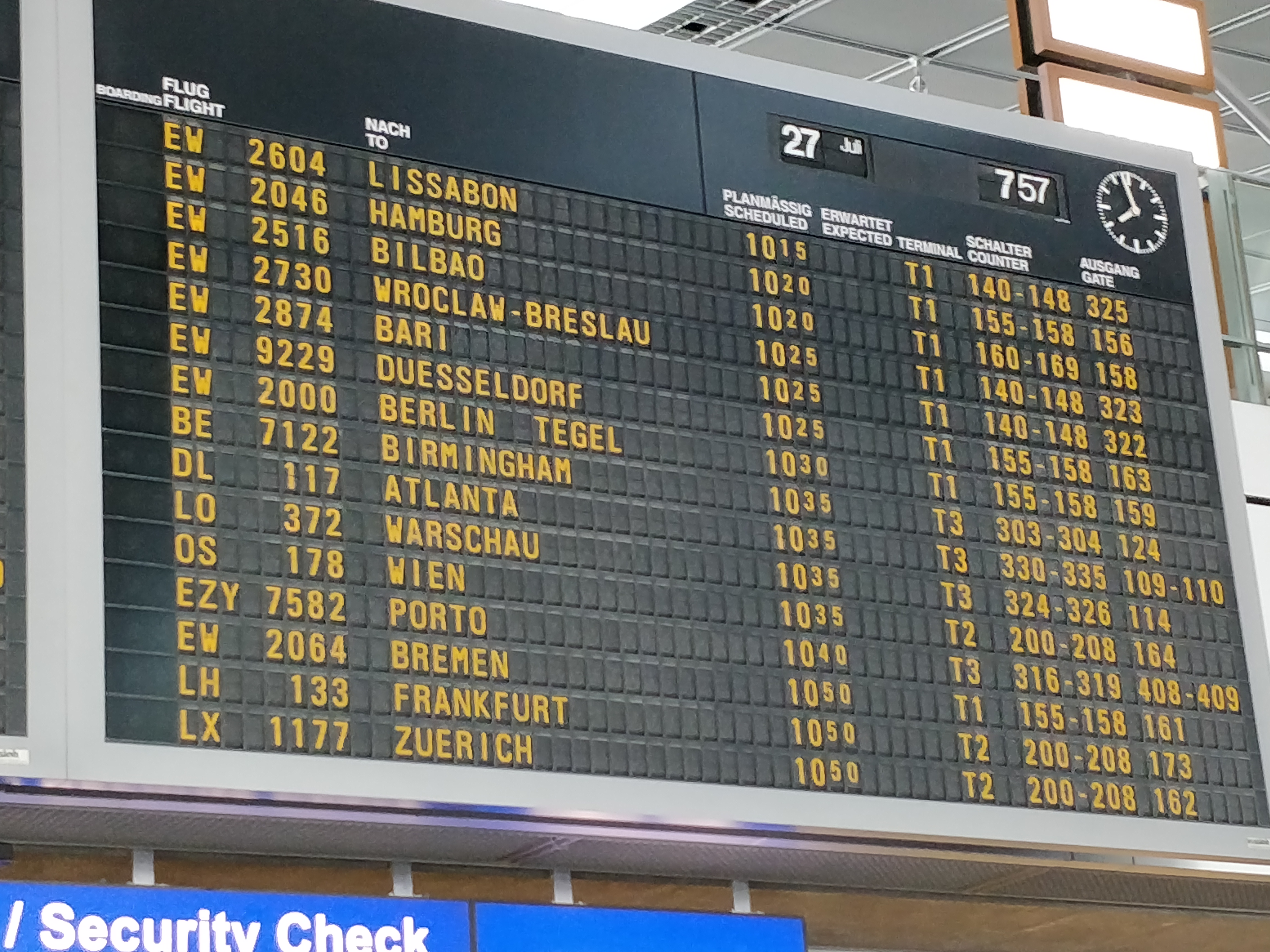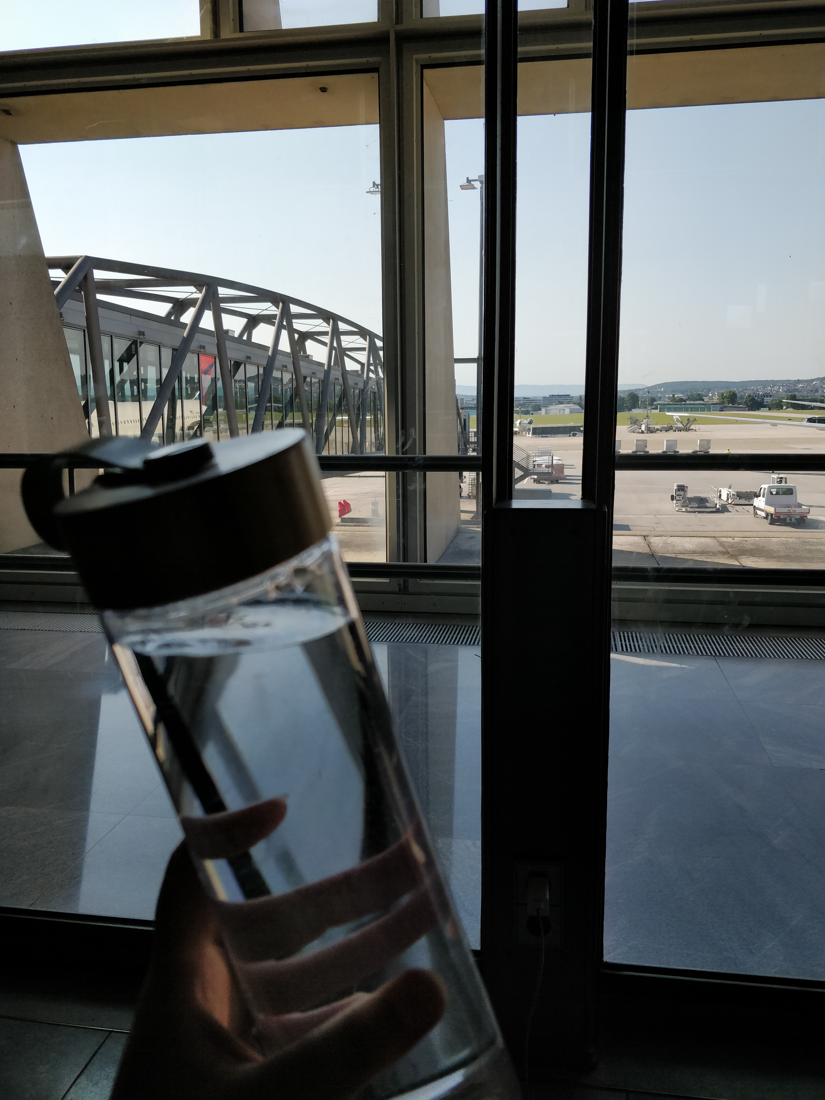 Insgesamt kamen wir dann doch gut durch, kurz nach Sieben war ich bereits am Flughafen. Noch eben den Schalter für das Gepäck finden – dann heißt es warten. Gegen 8:30 öffnet dieser (immerhin ist man gleich als Erster dran), und schwupps ist das aufgegebene Gepäck weg. Mit dem Handgepäck-Rucksack ab an die Security, davor noch ein letztes Mal wehmütig drücken – ab hier geht es alleine weiter. Der frühen Flugzeit und der noch früheren Ankunftszeit sei Dank ist dort noch alles ruhig. Eine Wartezeit von 1-3 Minuten ist für die penible Security geradezu paradiesisch. Um 9 ist man dann mit allem durch, das Gate wurde auch schon gefunden. Bis das Boarding um 10:05 beginnt schnappt man sich einen Fensterplatz, und genießt die noch ruhige Wartezeit mit einem frischen Schluck deutschem Hahnenwasser.